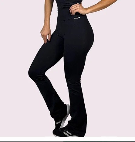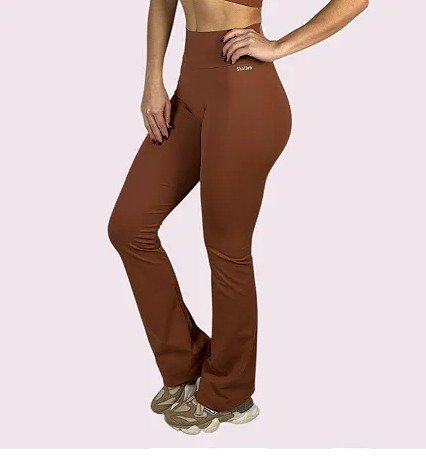 Esta calça é confeccionada com modelagem Flare em cós reto.